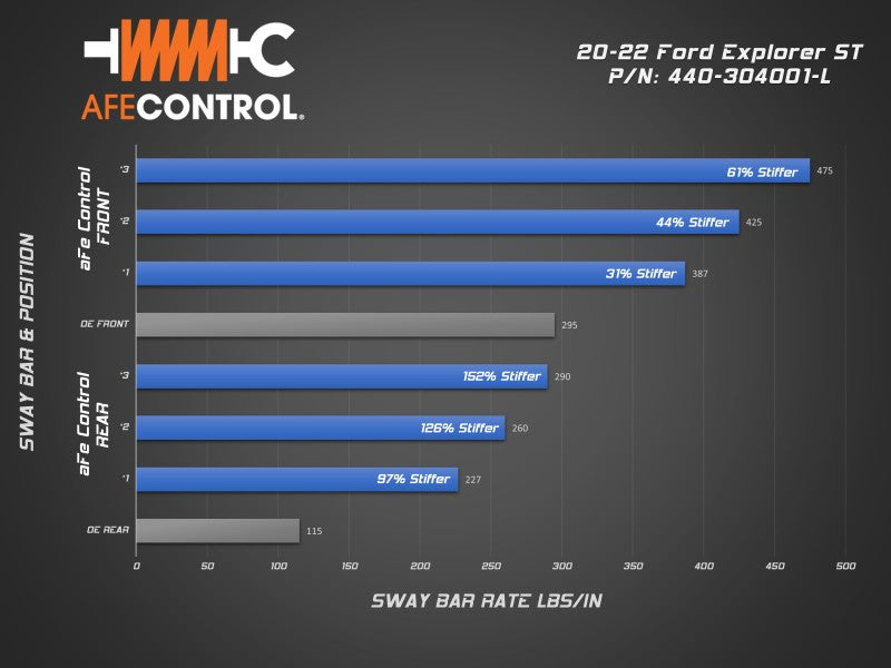 Dramatically reduce body roll without sacrificing ride quality with aFe CONTROL’s Explorer ST sway bars. Our 3-way adjustable front sway bar will allow you to easily dial in the handling balance of your ST. Sharpened steering response will improve initial turn-in making your Explorer feel lighter and more agile. The added stability and control are also welcome when hauling loads on your roof rack or towing. Whether you’re on a road trip with the family or canyon carving in the mountains, aFe CONTROL will get you there. Every aFe CONTROL sway bar is CAD designed and CNC bent to strict tolerances. This insures precise fit and perfect operation. Our front sway bar is 3-way adjustable. This allows the driver to dial in the front roll resistance to achieve the desired handling bias. The front sway bar utilizes CNC machined ends. These are robotically welded to the bar in a dedicated fixture to insure accurate hole positioning and consistent manufacturing. aFe CONTROL includes low-deflection polyurethane bushings and premium 6061-T6 aluminum black anodized billet brackets.