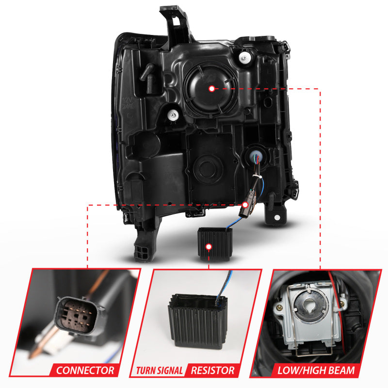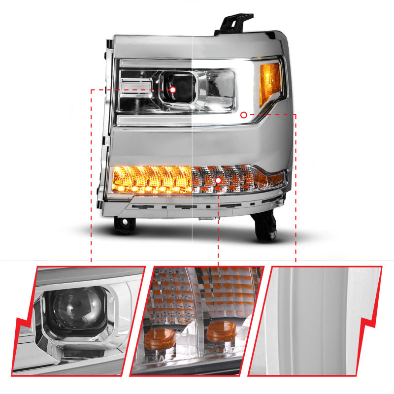ANZO 16-18 Chevy Silverado1500 (Factory HID Models) LED Prj Light Bar Style Headlights Chrome - Pair