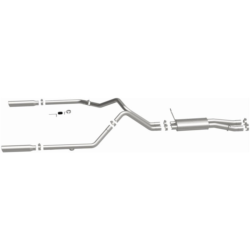 The MagnaFlow Street Series Cat-Back Performance Exhaust System 15829 brings out the personality of your Truck with our signature resonant, powerful engine tone and dyno-proven performance. Thanks to its fast-flowing, mandrel bent 3in. main piping and 1 Straight-Through mufflers ending in a Dual Split Rear exit with 3.5in. Polished Clamp-On Single Wall Angle Cut Rolled Edge tips, this Truck exhaust kit has the performance chops to match its sporty sound and appearance. Upgrade your ride to the next level with an exhaust that has the pipes to put other Truck's to shame. With this system your vehicle will be producing Aggressive exterior and Moderate interior sound levels while leaving other cars and trucks feeling envious at every stoplight. Exhaust kit 15829 features a cat-back layout that replaces your ride's stock exhaust components from near the catalytic converter on back. Extensive 3D scanning during development has resulted in a direct-fit design that you can easily install yourself. 15829 is produced using CNC precision robotic manufacturing techniques and is backed by MagnaFlow's 1-year limited finish warranty and limited lifetime construction warranty.
