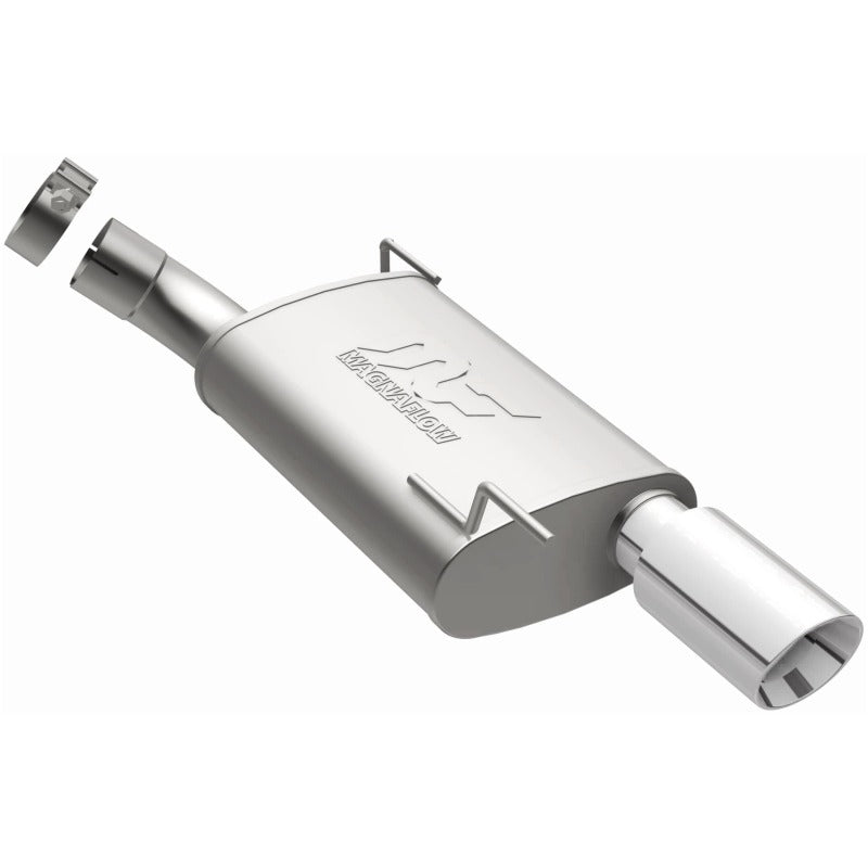 The MagnaFlow 2005-2009 Ford Mustang Street Series Axle-Back Performance Exhaust System 15889 brings enhanced engine sound and dyno-proven performance to your 4.0L 2005-2009 Ford Mustang with a healthy helping of our deep, resonant signature exhaust note at Moderate exterior and Mild interior sound levels. Thanks to its durable, corrosion resistant stainless steel design, this Ford Mustang exhaust system will handle whatever tarmac you decide to leave your mark on. This performance exhaust kit features an axle-back layout designed to replace your Ford Mustang's exhaust system from near the rear axle on back. With its fast-flowing, mandrel bent 2.5in. main piping and 1 Straight-Through mufflers ending in a Single Straight Passenger Side Rear exit with 3.5in. Polished Welded-On Double Wall Angle Cut Folded Edge tips, your ride will be sounding as awesome as it looks. Extensive 3D scanning during development has resulted in a direct-fit design that you can easily install yourself. 15889 is produced using CNC precision robotic manufacturing techniques and is backed by MagnaFlow's 1-year limited finish warranty and limited lifetime construction warranty.