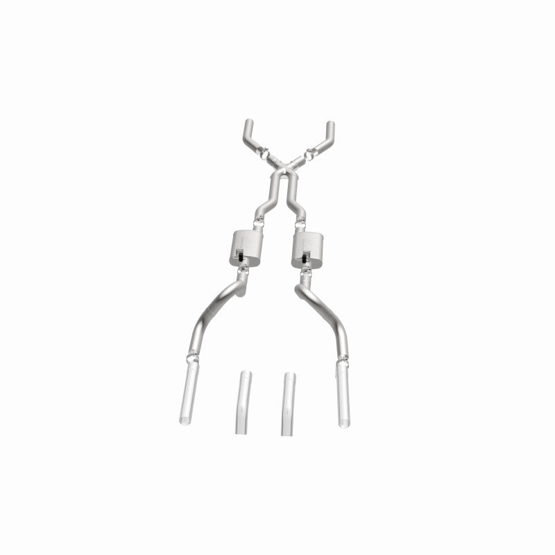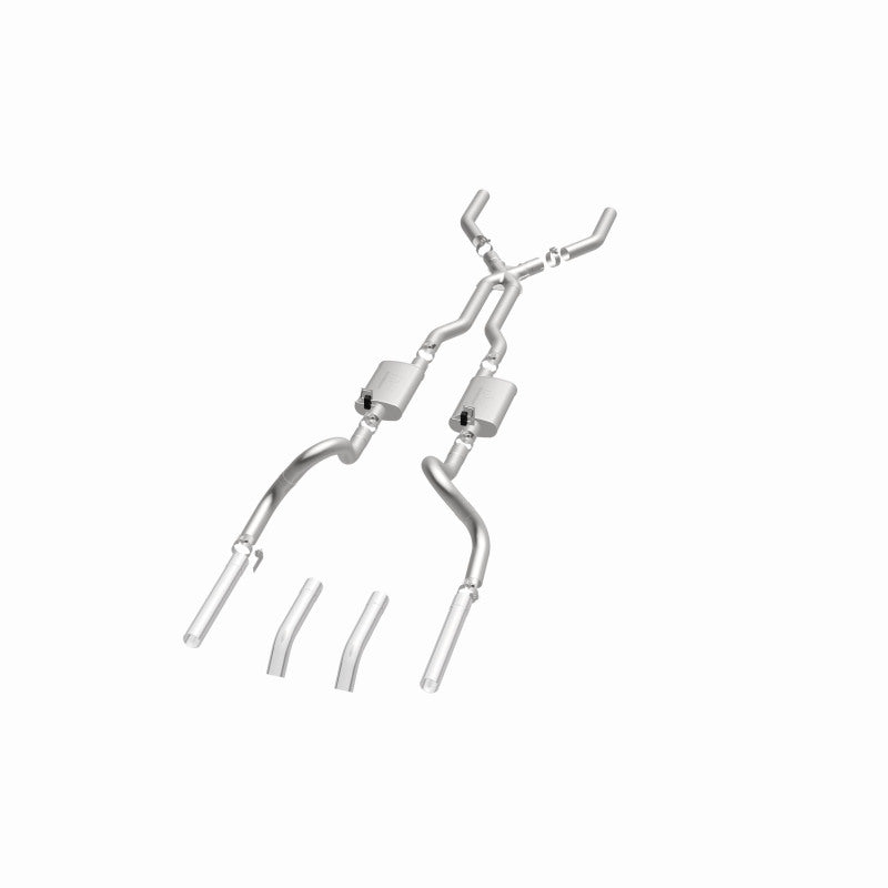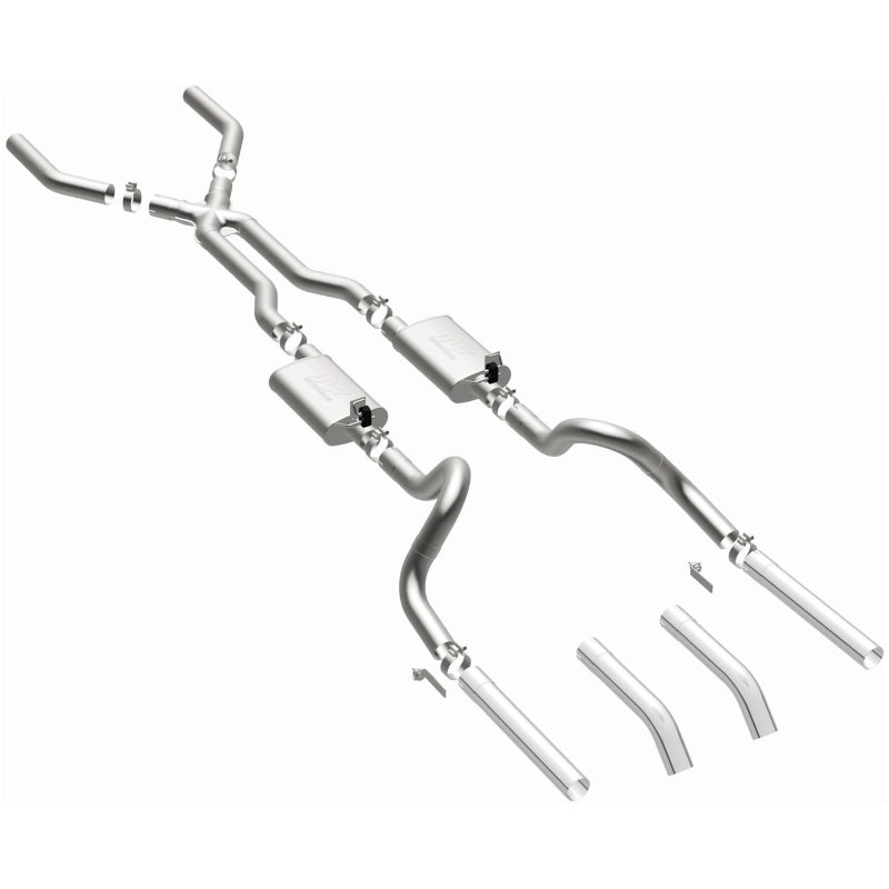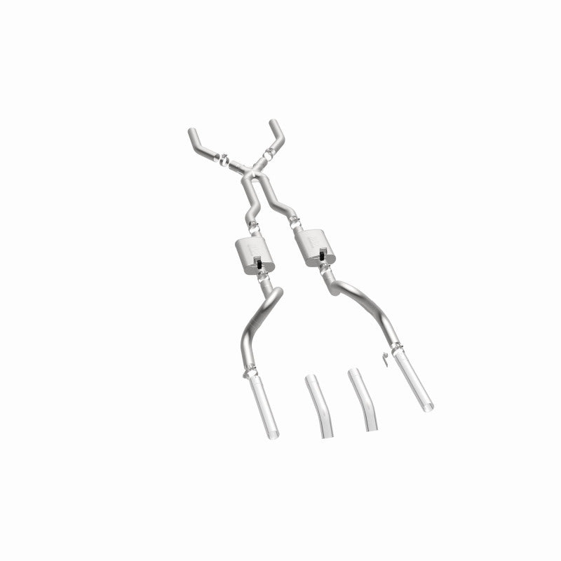 The MagnaFlow 1967-1970 Ford Mustang Street Series Crossmember-Back Performance Exhaust System brings enhanced engine sound and dyno-proven performance to your 3.3L, 4.1L, 4.7L, 5.0L, 5.8L, 6.4L, 7.0L 1967-1970 Ford Mustang with a healthy helping of our deep, resonant signature exhaust note at Aggressive exterior and Moderate interior sound levels. Thanks to its durable, corrosion resistant stainless steel design, this Ford Mustang exhaust system will handle whatever tarmac you decide to leave your mark on. This performance exhaust kit features a crossmember-back layout designed to replace your Ford Mustang's exhaust system from the crossmember on back. With its fast-flowing, mandrel bent 3in. main piping and 2 Straight-Through mufflers ending in a Dual Split Rear exit that you can enhance with tips of your choosing, your muscle car will be sounding as awesome as it looks. Extensive 3D scanning during development has resulted in a direct-fit design that you can easily install yourself. 15819 is produced using CNC precision robotic manufacturing techniques and is backed by MagnaFlow's limited lifetime construction warranty.